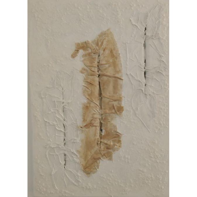 Tela: fondo stucco liquido e sale, tagli verticali coperti da tessuto, ho riportato nel retro i miei versi poetici i quali hanno ispirato l'opera, versi: Crepe Velate - Posare lo sguardo confuso - intravvedendo il mondo al di fuori di sé - da crepe velate di apparenze - gelide come un manto innevato - e scorgere riflessa l’immagine - del proprio rammarico - che scopre un’inquietudine deturpata del proprio senso dell’essere emergendo al centro della coscienza - infangata da inquietudini - di non essere ciò credevi - limitando il procedere nel proseguire - il proprio cammino