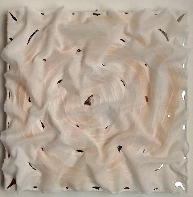 tecnica mista fondo acrilico e spennellate oro, tessuto di garza con frammenti di specchi, ispirato dai miei versi che riporto nel retro. Fluttuare - Con te fluttuavo come le fronde leggiadre - Con te ondeggiavo come il soffio leggero marino - Con te svolazzavo come le farfalle a primavera - Con te oscillavo nella piacevolezza di possederci - Con te abitavo la seduzione e la delizia - Fluttuare insieme a te verso altre dimensioni - è stato fluire nella delicatezza - dove esprimere l’essenza dell’accoglienza - con te ho percorso le linee dell’infinito - riflettendo nella luce dei tuoi occhi - fluttuando nella meraviglia dell’amore - Con te immortale amore - lascio fluire le sensazione ancestrali - conservandole nel mio cuore - nell’attesa di riunirci