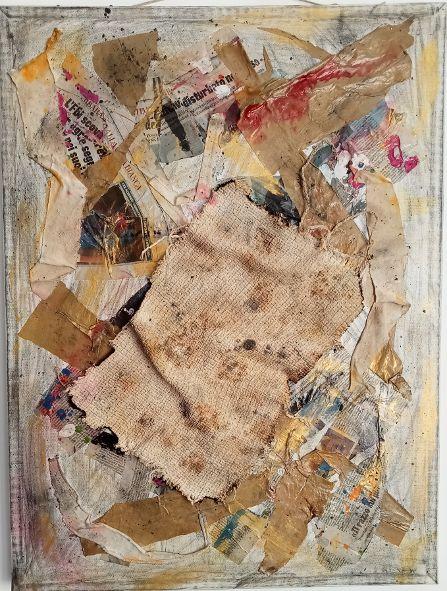 Fondo colorato con carbone, patcwork di pezzi di carta, giornale e tessuto, con schizzi di colore ecoline e oro, al centro tessuto lasciato ammuffire nell'organico vegetale.