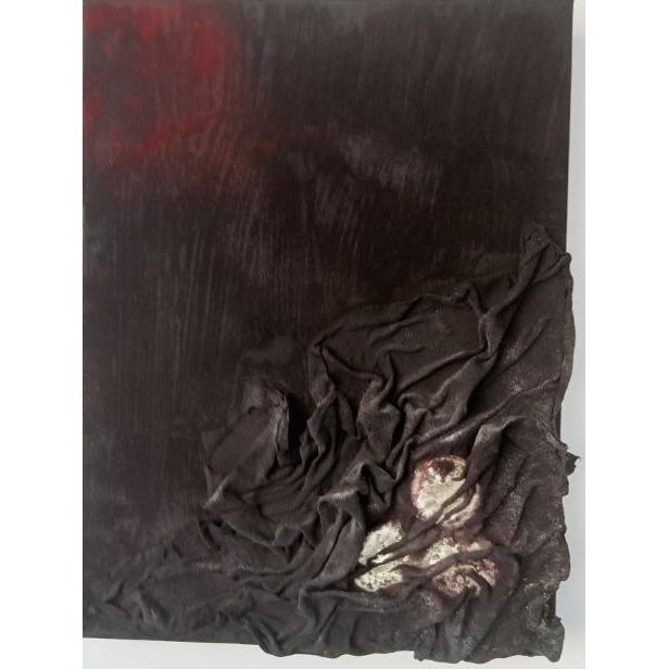 Tela, fondo carbone vegetale e polvere di barbabietola, applicazione di tessuto e materiale organico macerato e ammuffito, successivamente igienizzato e fissato.