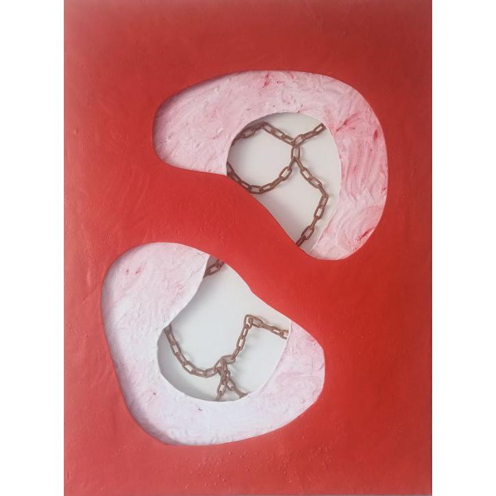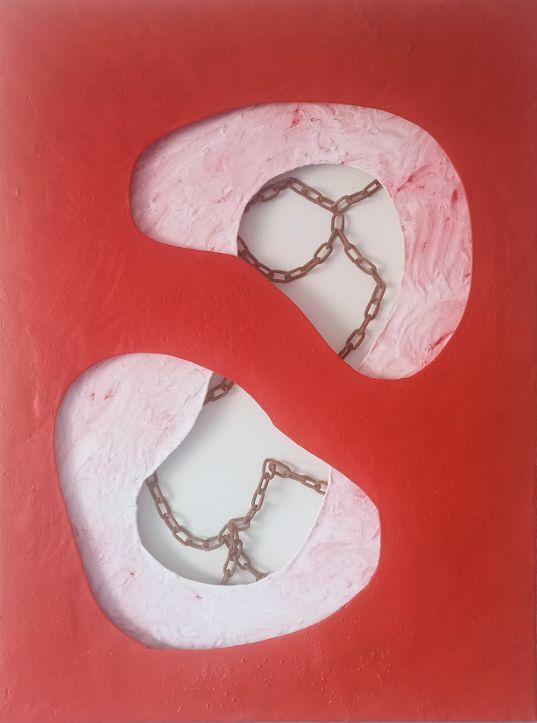 Tre tele sovrapposte e forate, tela inferiore acrilico e applicazione di catena, tela intermezzo stucco liquefatto e pigmento, tela superiore stucco liquefatto e colorato con pigmento.