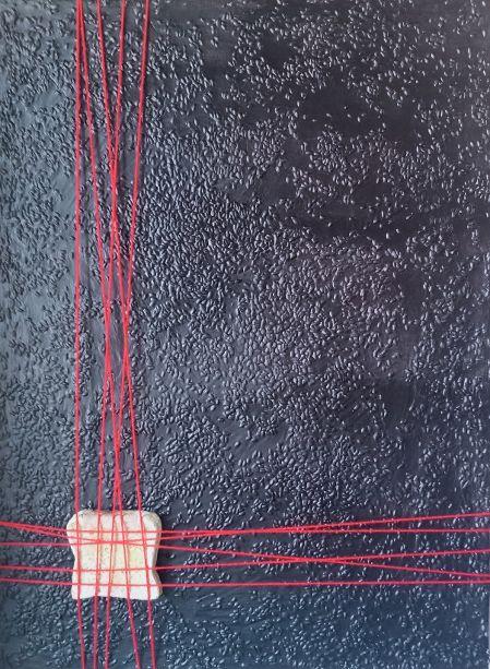 Fondo stucco liquefatto e riso, applicazione di pane e legatura con filo.